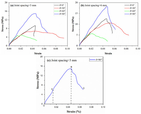 The stress–strain curves of coal sample under different JS and JA are shown in Figure 2. As indicated by the Figure, the curve was separated into three phases (Figure 2c): fissure closure phase (OA), elastic compaction phase (AB), and damage destruction phase (BC).