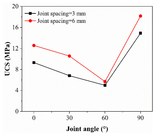 From Figure 3, it could be noted that when JS = 3 mm, as JA increased from 0° to 90°, the UCS of the coal sample decreased initially from 9.31 MPa to 4.98 MPa and then increased to 14.91 MPa and achieved a minimum value of 4.98 MPa when JA was 60°. When JS = 6 mm, the curve had the same pattern, and the curve acquired a minimum value of 5.69 MPa at JA of 60°. This result was the same as that of Zhou et al. [29]. The results demonstrated that the UCS of the coal sample displayed a “V”-shaped changed with the increase in JA. Comparing the curves of JS = 6 mm and JS = 3 mm, it was observed that the latter was smaller than the former. The findings suggest that the increase in JS was favorable to the increase in UCS of the sample. In short, JS enhanced the strength of sample.