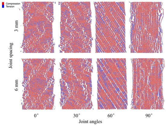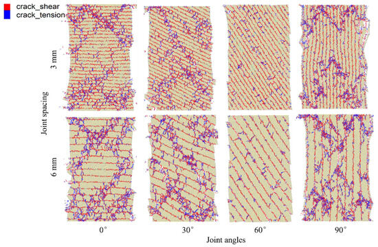 To further analyze the effects of JS and JA on the damage pattern of coal sample from a microscopic point of view, the PFC 7.0 software monitoring command was employed to plot the distribution of the damage pattern of coal sample, as shown in Figure 4 (in which red represents shear cracks, and blue represents tensile cracks).