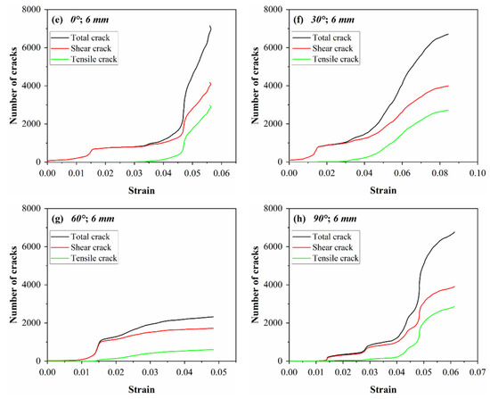 As shown in Figure 5e, shear cracks steadily increased as loading proceeded, appeared as an inflection point at 0.015, while shear cracks further increased. This could mean that the crack extension of coal pattern at this stage is dominated by shear cracks. When the strain was 0.035, a tensile crack appeared. With the further increase in axial strain, the number of shear and tensile cracks gradually increased. The shear and tensile cracks reached the maximum value when the peak strain was reached. Currently, the percentage of shear cracks was 75%, the percentage of tensile cracks was 1/3 of shear cracks, and the damage was dominated by shear. The evolution of tensile and shear cracks with different JA was the same as that of JC = 3 mm, but the percentage of shear cracks was lower than that of JC = 3 mm. The results indicated that the increase in JC was favorable for the generation of tensile cracks.