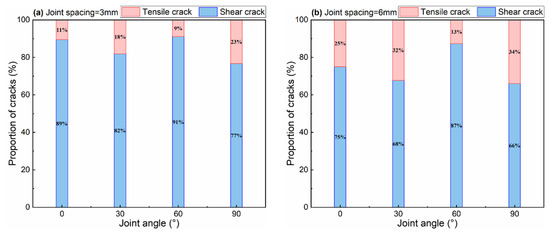 To quantitatively describe the varying characteristics of cracks in different JSs and JAs coal sample during the loading process, the different kinds of cracks with strain evolution pattern were plotted, as shown in Figure 5. The percentage of tensile cracks and shear cracks at peak strength for different JSs and JAs coal sample were also summarized, as shown in Figure 6.