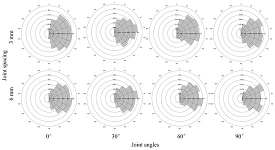 When JS = 6 mm and JA = 0°, the crack tendency was mainly spread in the range of 38–125°. With the gradual increment of JA from 0° to 90°, the microcrack tendency was concentrated in 50–110°, 30–130°, and 50–110°. Comparing JS = 3 mm and JS = 6 mm coal sample, it was noted that the distribution range of crack tendency was larger in the former. It indicated that JS = 3 mm had the highest micro-cracker number and was the earliest to reach yielding under axial loading.