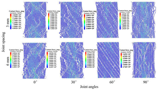 Figure 9 shows that the force chain size distribution of the coal sample continuously transferred as the external load was imposed. When the specimen reached the peak stress, the force chain size distribution tended to stabilize. To analyze the effect of JA on the force chain size and its distribution, JA = 0° and JS = 3 mm were considered as examples. The size distribution of the force chain ranged from 7.5 × 103–2.25 × 104 N, mainly distributed in the upper middle and lower middle, and the force chain was distributed in the middle of the upper “X”-type fracture surface. With the increase in JA from 0° to 60°, the size of force chain gradually concentrated to 2.0 × 104–1.0 × 104 N, and the size increased significantly. The distribution of the force chain gradually moved from the upper middle and lower middle to the middle and formed the upper and lower penetration. When JA increased from 60° to 90°, the size of the force chain was concentrated to 2.75 × 104–1.75 × 104 N, and the size increased further. The force chain distribution was further aggregated toward the middle and through the top and bottom, but the density of aggregation toward the middle increased significantly. The results showed that JA could significantly change the force chain size and its distribution characteristics.