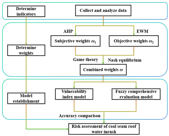 Mine roof water inrush represents a prevalent hazard in mining operations, characterized by its concealed onset, abrupt occurrence, and high destructiveness. Since mine water inrush is controlled by multiple factors, rigorous risk assessment in hydrogeologically complex coal mines is critically important for operational safety. This study focuses on the roof water inrush hazard in coal seams of the Banji coal mine, China. The conventional water-conducting fracture zone height estimation formula was calibrated through comparative analysis of empirical models and analogous field measurements. Eight principal controlling factors were systematically selected, with subjective and objective weights assigned using AHP and EWM, respectively. Game theory was subsequently implemented to compute optimal combined weights. Based on this, the vulnerability index model and fuzzy comprehensive evaluation model were constructed to assess the roof water inrush risk in the coal seams. The risk in the study area was classified into five levels: safe zone, relatively safe zone, transition zone, relatively hazardous zone, and hazardous zone. A zoning map of water inrush risk was generated using Geographic Information System (GIS) technology. The results show that the safe zone is located in the western part of the study area, while the hazardous and relatively hazardous zones are situated in the eastern part. Among the two models, the fuzzy comprehensive evaluation model aligns more closely with actual engineering practices and demonstrates better predictive performance. It provides a reliable evaluation and prediction model for addressing roof water hazards in the Banji coal seam.