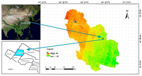 The Banji coal mine is located in Lixin County, Bozhou City, Anhui Province, with a relatively flat terrain and a ground elevation ranging from +24 to +26 m (Figure 2). The mining area encompasses nine workable coal seams exhibiting a mean aggregate thickness of 20.66 m. Principal extractable seams (Nos. 8, 5, and 1) demonstrate a combined average thickness of 12.83 m.