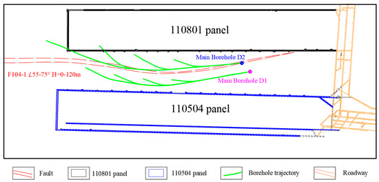 The F104-1 fault in the area is located to the north of the 110504 panel at Banji coal mine (Figure 3). It strikes NEE, dips NNW at angles of 55° to 75°, with a vertical displacement of 0 to 120 m. The fault extends over a length of 3800 m, with a fault zone width ranging from 0 to 10.3 m. It intersects the 11-2, 8, 5, and 1 coal seams, the Taiyuan formation, and Ordovician limestone, cutting downward into the Ordovician limestone and upward to the base of the loose layer. To prevent fault reactivation, exploration and treatment were carried out on the F104-1 fault between the 110801 and 110504 panel at the Banji coal mine. Two sets of directional boreholes were designed. The D1 borehole group is the upper set, exploring and treating the sandstone base of No. 9 coal seam at a depth of approximately 21 m. The D2 borehole group is the lower set, exploring and treating the layer near the Taiyuan formation 10 gray. After grouting and strengthening treatment, the threat of fault-induced water inflow to coal seam mining was reduced.