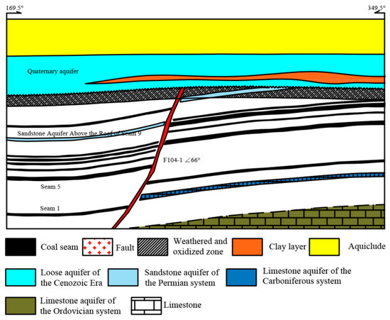 In the region, the aquifers and aquifuges are primarily composed of loose sediments from the Cenozoic, as well as aquifers and aquifuges from the Permian system, Carboniferous limestone aquifers and aquifuges, and Ordovician limestone aquifers (Figure 4). The lithology and thickness of the sandstone fracture aquifer vary greatly, and its distribution is unstable. Predominantly comprising medium- to fine-grained sandstone, this stratum constitutes the mine’s immediate water-bearing aquifer. According to exploration data and actual underground exposure, the sandstone aquifer above No. 9 coal seam in the Permian sandstone fracture aquifer has relatively strong water abundance. The roof of No. 9 coal seam develops two relatively stable layers of sandstone, with the primary water-bearing layer being the upper sandstone.