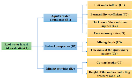 Proposed by Saaty in the early 1970s, the AHP constitutes a subjective weighting method. It hierarchically decomposes decision elements (goal, criteria, alternatives) for integrated qualitative–quantitative analysis, rendering this systematic approach simple, flexible, and effective [31]. Given multi-factor control of roof water inrush, AHP proves applicable for constructing corresponding risk evaluation models.