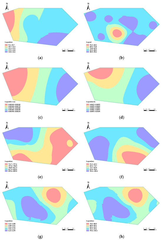Thematic maps of main controlling factors. (a) Thickness of sandstone aquifer; (b) core recovery rate; (c) unit water inflow; (d) permeability coefficient; (e) mining depth; (f) thickness of Quaternary aquifer; (g) cutting height; (h) height of water-conducting fracture zone.