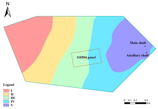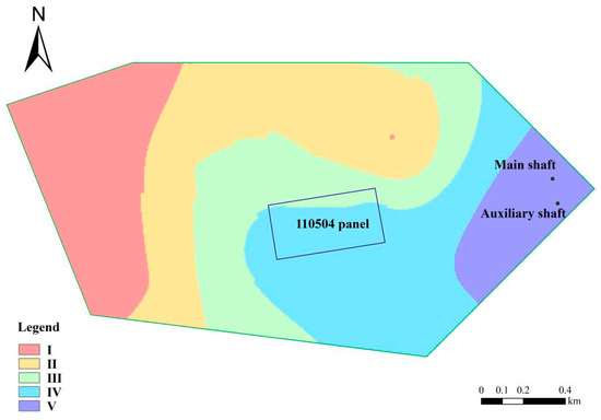 The normalized data were substituted into the vulnerability index evaluation model, and the thematic map of the roof vulnerability index was generated using ArcGIS software (version 10.8.1). The Jenks natural breaks classification method was employed to delineate roof water inrush risk zones, subsequently yielding threshold values of 0.42, 0.49, 0.56, 0.63, and 0.73. A higher vulnerability index IV indicates a higher risk of water inrush. The zoning evaluation map (Figure 9) similarly shows that the 110504 panel is mainly located within the transition zone and the relatively hazardous zone.
