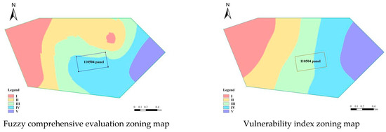The zoning results exhibit only minor differences between the two evaluation models. Both models indicate that safe zones predominantly occur in the study area’s western sector, whereas hazardous and relatively hazardous zones consistently manifest in the eastern sector. Water inrush once occurred at the main shaft and auxiliary shaft. Investigations revealed that the water inrush layer at the main shaft was the sandstone aquifer of the No. 9 coal roof, and that at the auxiliary shaft was the Quaternary aquifer. In the results of both models, the locations of the main shaft and auxiliary shaft are in the hazardous zone, which is consistent with the on-site actual situation. Furthermore, in Figure 8 and Figure 9, the 110504 panel was mined from west to east. Subsequently, mining was halted due to excessive mine water inflow. This finding aligns with the fuzzy comprehensive evaluation model, where hazardous zones similarly concentrate within the study area’s eastern sector. However, in the vulnerability index model, the hazardous areas did not appear in the advancing direction of the panel. In summary, the accuracy of the results from the fuzzy comprehensive evaluation model is 33% higher than that from the vulnerability index model. For the Banji study area, the application of the fuzzy comprehensive evaluation model can more accurately predict and assess roof water hazards.