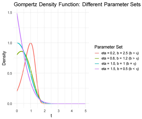 The shape of the Gompertz density function is jointly determined by the parameters (the initial risk intensity) and b (the risk growth rate), and it exhibits two typical patterns, which can be seen in Figure 1. When , the graph of the density function shows a unimodal and right-skewed distribution. It reaches its peak at the mode position and then decays at an exponential rate. When , the density function displays a monotonically decreasing trend, reaching its maximum value at , with . The density function continues to decrease as t increases, without exhibiting any local extrema.