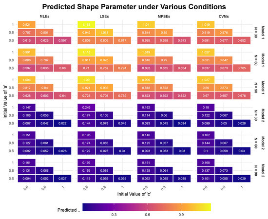 In Figure 2 (results of Model 2), it is evident that, for the same value of c, the predicted value of increases with increasing a. In contrast, for the same value of a, the predicted value of decreases with increasing c due to . Comparing the results from the two models, it is clear that Model 2 provides more stable results and reflects the variations in with changes in a and c more accurately. From this perspective, we can conclude that Model 2 is a better fit for the Gompertz distribution under accelerated life testing (ALT).