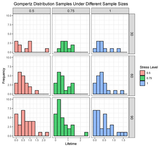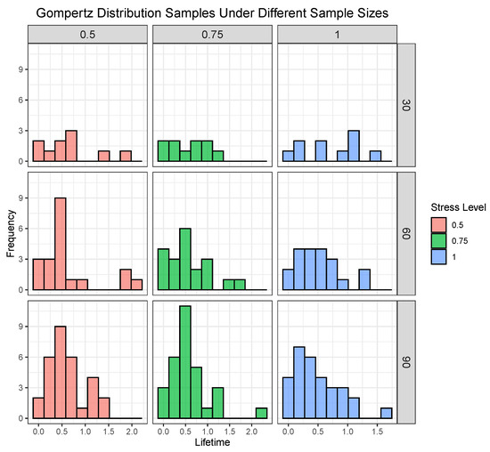 - Generate N random samples from the Gompertz distribution under the CSALT, and assign N equally to each stress level.
