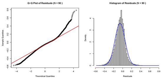 Figure 4. Comparison between empirical distribution and theoretical distribution. - Impact on LSE Residual Normality and Estimator Stability:A parallel analysis of the LSE residuals underscore the criticality of sample size. For sparse datasets ( and ), the residuals are fundamentally non-normal. Formal statistical tests confirmed this observation, yielding values (e.g., for , Shapiro–Wilk’s ) that indicate a complete failure of the normality assumption. This suggests that the estimator is unstable and the residuals are dominated by systematic model misspecification. A watershed moment is observed at , where the Shapiro-Wilk statistic jumped to 0.979, signaling that the residual distribution had become highly consistent with normality, which is shown in Figure 5. This convergence highlights that an adequate sample size is a prerequisite for the LSE estimator to achieve stability and robustness.
