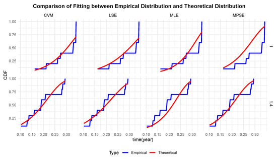 We obtained a real dataset from the Reliasoft website (http://www.reliasoft.com/newsletter/lq2002/qalt.htm, (accessed on 6 January 2025)), which has been previously analyzed in studies conducted by Abdel Ghaly [17] and Mazen Nassar [19]. This dataset records complete failure times, and therefore no censoring is present. We use liquid density as the stress levels (1 g/mL and 1.4 g/mL) and record the failure times (in years) of a pump’s motor. The collected data are presented in Table 11. We analyze the data by calculating the Kolmogorov–Smirnov (K–S) distances and corresponding p-values for each stress level. Table 12 demonstrates the strong overall performance of the model at two stress levels, 1 g/mL and 1.4 g/mL. For 1 g/mL, the K–S distance is 0.3113, accompanied by a p-value of 0.2868, indicating a good fit between the distributions. At 1.4 g/mL, the model shows even greater fitness, with a smaller K–S distance of 0.1928 and a significantly higher p-value of 0.7854, reflecting a closer match. While both stress levels exhibit satisfactory results, 1.4 g/mL exhibits a superior fit. In this study, we only use Model 2 to estimate the parameters.