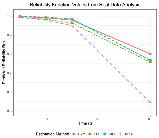 Furthermore, we calculate the K–S distance along with the corresponding p-value of four methods for each dataset unit. We show the results in Table 16. At stress level 1.0, the CVM method performs best, with the lowest K–S distance (0.2871) and the highest p-value (0.3180). The MLE and LSE methods show similar and relatively good performance, with slightly higher K–S distances and lower p-values. The MPSE method performs the worst, having the highest K–S distance (0.4567) and the lowest p-value (0.0200). At stress level 1.4, the LSE method achieves smallest K–S distance (0.1705) and the highest p-value (0.8880). The CVM method ranks second, with a low K–S distance (0.2196) and a high p-value (0.6448). The MLE and MPSE methods show relatively weaker performance. Overall, the CVM method is the best fit at lower stress levels, while the LSE method performs best at higher stress levels. The MPSE method shows poor fitting results under both stress levels. In conclusion, a normal stress level of is set to estimate the system parameters under normal conditions. The reliability of the system at (in years) can be obtained in Table 17, which has been shown in Figure 7 more directly.
