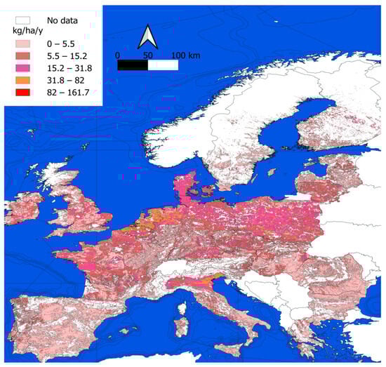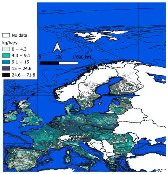 Our analysis exclusively utilized pre-processed data. The INTEGRATOR model was employed to determine nitrogen (N) leaching to groundwater and N runoff to surface water. This was achieved by first establishing N fluxes through a soil balance approach, involving the calculation of N budgets across approximately 40,000 unique combinations of soil type, administrative region, slope, and altitude. Data inputs drew from Eurostat 2010 statistics on fertilizer, manure, and biosolids application, as well as EMEP (European Monitoring and Evaluation Programme) for N deposition data. The dataset does not separate nitrogen sources into manure or synthetic fertilizers. The N surpluses were subsequently calculated as the difference between N input and crop N removal. Finally, the INTEGRATOR model specifically quantified the biological processes related to the fate of the N surplus, which directly encompassed its losses to both groundwater and surface water. This data, featuring a 1 km spatial resolution in the EPSG:3035 coordinate reference system, is obtainable from the EEA and is freely available for public access under their standard re-use policy. Nitrogen runoff to surface water and leaching to groundwater was quantified in kg/ha/year. We utilized QGIS 3.34.8 to process this data and generate the map.