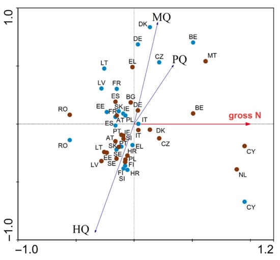 Ordination diagram of the RDA analysis for the quality of groundwater and surface water in terms of nitrate content. HQ—high water quality, MQ—medium water quality, PQ—poor water quality. Blue points indicate surface water, brown points indicate groundwater. Country codes: BE—Belgium, CZ—Czech Republic, DK—Denmark, DE—Germany, EE—Estonia, IE—Ireland, EL—Greece, ES—Spain, FR—France, HR—Croatia, IT—Italy, CY—Cyprus, LV—Latvia, LT—Lithuania, AT—Austria, PL—Poland, PT—Portugal, RO—Romania, SI—Slovenia, SK—Slovakia, FI—Finland, SE—Sweden. Sample size—N = 47.