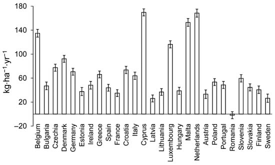 - Kremer, A.M. Directorate E: Sectoral and Regional Statistics, Unit E-1: Agriculture and Fisheries. In Methodology and Handbook Eurostat/OECD Nutrient Budgets EU-27, Norway, Switzerland, Version: 1.02; European Commission; Eurostat: Luxembourg, 2013. [Google Scholar]