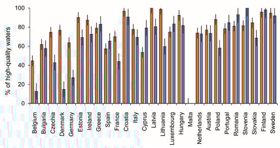 The differences presented as percentages in Figure 6 should be interpreted in the following way. The y-axis expresses the percentage of high-quality water, but the bars do not directly indicate the percentage difference between EU27 states in a relative sense. Instead, they show absolute values i.e., the proportion (in %) of high-quality waters in each state. If the x-axis represents the mean value for each country and the standard error (SE), then each country’s bar on the y-axis shows its own value, not the deviation in percent from the base mean. The difference between a state and the average can be described in percentage points, not percentage (which would imply a relative difference). The bars indicate the percentage of high-quality waters in each EU state. In summary, differences between EU states should be read as percentage points, not as percentages.