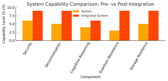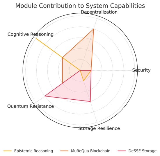 Figure 1 sketches a side-by-side portrait of the legacy platform and its modern upgrade. On every axis-security, decentralisation, cognitive agility, tolerance to quantum attack, and sheer storage grit-the latest build bests the older model. That leap springs from a modular design in which epistemic reasoning, MuReQua, and DeSSE tackle separate, yet intertwined, system chores. Their isolated performances lend shape to the radar plot in Figure 2, where decision sharpness, consensus strength, and data persistence visibly brighten. To spotlight individual module influence, Figure 2 trades prose for a spoke-and-dial graphic. Each arm flags how epistemic reasoning, the MuReQua registry, and the DeSSE vault feed the five capability gauges. The image makes the trio s complementarities plain.