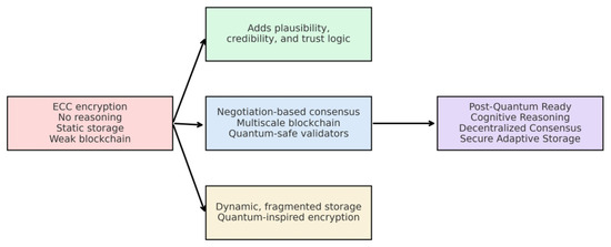 Figure 4 shows a full ecosystem architecture diagram that covers all the layers of implementation to show how those three main components work inside an emerging IoT system with quantum-inspired technology development. The hierarchy between epistemic reasoning (cognitive layer), MuReQua blockchain (consensus layer) and DeSSE storage (data layer), as well as its interaction with quantum machine learning for improved adaptability and autonomy of decision-making is further illustrated through the diagram.