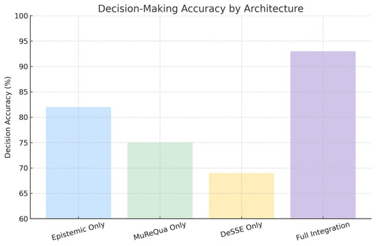 To maintain experimental consistency, each test cycle ran multiple repeated simulations subjected to a broad spectrum of stress conditions. Workloads were gradually increased by simulating 10 to 1000 simultaneous devices, deliberately mimicking burst data traffic and sudden node outages. The decision engine was calibrated using a form of weighted epistemic logic that adjusts belief scores based on data timeliness, source reliability, and situational context. In the MuReQua framework, validator selection occurs on the fly, influenced by relativistic round-trip delay and credential reputation within the application domain. Each fragment of the blockchain is recorded independently, allowing reviewers to track events with granularity, while state synchronisation delays are measured accurately to the nanosecond through high-resolution time sources. The attached graph (see Figure 6) shows the level of decision accuracy in different architectural permutations. The modules offer advantages in isolation, but only the full integration of each layer guarantees the stability and high fidelity promised by the experiments, underscoring the practical power of teamwork.