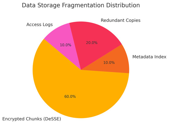 The pie chart in Figure 7 shows how the DeSSE storage level divides the available disc space: encrypted blocks occupy almost six-tenths of the total volume, while metadata, redundant copies, and access logs divide the rest into well-defined portions of ten and twenty percent. The scheme proves resilient: even if one-third of the nodes were to disappear, the remaining fragments could still be reassembled thanks to entropy-based reordering. In addition to simple distribution, the system exhibits adaptive intelligence, redistributing fragments in real time and enabling fully decentralised fragmentation operations.