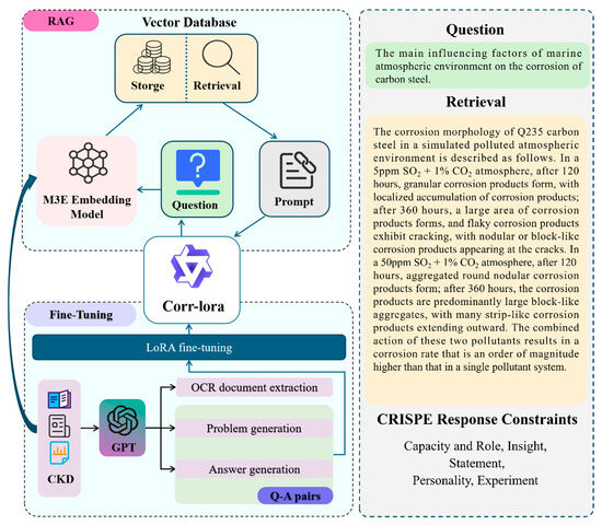 This study proposes a large language model, Corr-Lora-RAG, designed to address the complexity and uncertainty inherent in corrosion data. A dedicated corrosion knowledge database (CKD) was constructed, and dataset generation code was provided to enhance the model’s reproducibility and adaptability. Based on the Qwen2.5-7B model, the Corr-Lora model was developed by integrating prompt engineering and low-rank adaptation (LoRA) supervised fine-tuning (SFT) techniques, thereby improving the understanding and expression of domain-specific knowledge in the field of corrosion. Furthermore, the Corr-Lora-RAG model was built using retrieval-augmented generation (RAG) technology, enabling dynamic access to external knowledge. Experimental results demonstrate that the proposed model outperforms baseline models in terms of accuracy, completeness, and domain relevance, and exhibits knowledge generation capabilities comparable to those of large-scale language models under limited computational resources. This approach provides an intelligent solution for corrosion risk assessment, standards compliance analysis, and protective strategy formulation, and offers a valuable reference for the development of specialized language models in other engineering fields.