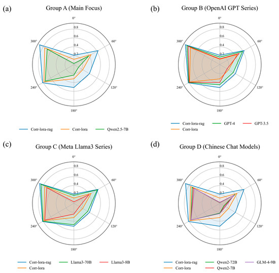 Performance of Corr-LoRA and Corr-LoRA-RAG across six metrics compared with: (a) baseline Qwen2.5-7B; (b) OpenAI GPT series (GPT-4, GPT-3.5); (c) Meta Llama3 series (70B, 8B); and (d) other leading Chinese chat models.