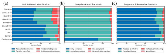 As shown in Figure 5a, in terms of Risk and Hazard Identification, Corr-LoRA-RAG achieved the highest proportion of “Accurate identification” at approximately 88%. This clearly surpasses both Corr-LoRA (approx. 75%) and large-scale general-purpose models such as GPT-4 (approx. 78%). The performance gap is even more significant when compared to other models like Llama3-8B (approx. 60%) and the Qwen2 series (ranging from 50 to 58%).