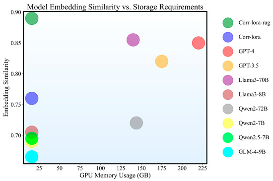 This study further explored the relationship between model performance and storage requirements, as illustrated in Figure 6. In the comparison of embedding similarity versus model storage footprint, Corr-LoRA-RAG demonstrated the ability to generate high-quality content while maintaining relatively low storage usage (approximately 20 GB), showcasing an excellent balance between performance and resource efficiency.
