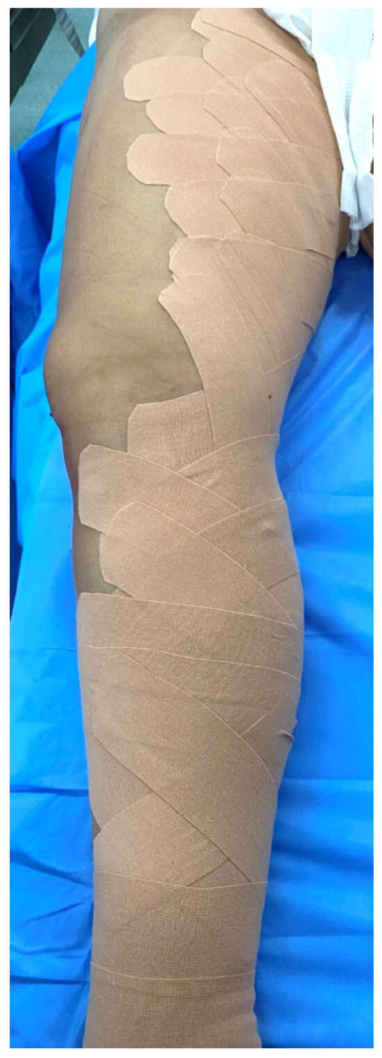 The experimental group received taping applied to the lower limb immediately post-surgery. The technique involved elastic bandages measuring 20 cm and 15 cm, arranged in a fish-scale pattern to optimize lymphatic and blood flow, using AKTive Tape® (Suzhou SunMed, Suzhou, China). The active tension applied in the functional region of the bandage was set at 80%, whereas the base and anchor sections (5 cm) were placed without tension to allow physiological adaptation (Figure 1).