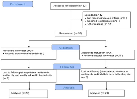 The clinical trial was conducted in accordance with the guidelines of the Consolidated Standards of Reporting Trials (CONSORT). One researcher was responsible for determining participant eligibility and conducting assessments using a standardized anamnesis form. A second researcher was in charge of randomizing participants into their respective groups and performing therapeutic procedures, while a third researcher analyzed the data, remaining blinded to group allocation.