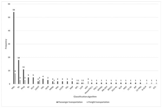 The number of papers with specific classification algorithm models is presented in Figure 3. Among decision-making models, the MNL model is the most frequently used, both as a primary model and as a benchmark for comparison, appearing in 62 papers: 54 in passenger transportation studies and 8 in freight transportation studies. Researchers also use the MNL model to evaluate the effectiveness of other decision-making models, either newly adapted or developed from the existing MNL framework [4].