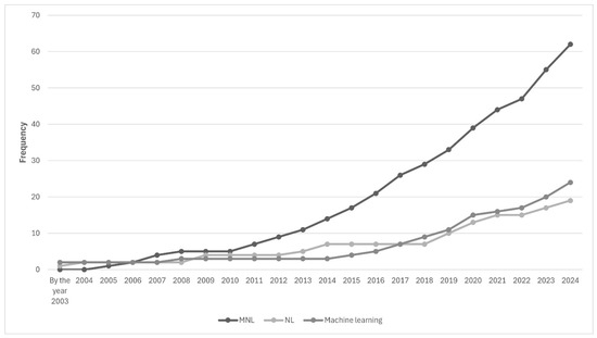 Since 2017, there has been a notable acceleration in the number of studies utilizing ML, a trend that can be attributed to the emergence of advanced modeling approaches grounded in ML methodologies. Including the year 2017, ML methods were employed in 19 studies. Examples include Paredes et al. [18], who applied RF, SVM, DT, and XGB to investigate how ML models can outperform DCM in predicting car ownership in Singapore, and Díaz-Ramírez et al. [19], who utilized DT, RF, SVM, and XGBoost for predicting transportation mode choice preferences in a university district. In contrast, prior to 2017, ML methods had been used in only five studies. For instance, Omrani [20] applied NNs (Multi-Layer Perceptron and Radial Basis Function) as well as SVM to predict travel mode choice of individuals in the city of Luxembourg. The shift toward the use of ML models can also be linked to the increasing availability of travel data in recent years. These include datasets generated through integrated public transport smart cards [21], or data from shared mobility applications [22]. Such data sources were not available in the past, when researchers relied primarily on traditional methods of data collection, including government statistical databases collected through traditional methods, travel surveys, and questionnaires. Despite recent developments in ML methodologies, MNL still remains the predominant modeling approach. The popularity of the MNL model can be attributed to its widespread use, simplicity, and interpretability. These characteristics make it not only a common choice as a primary modeling approach but also a valuable benchmark against which newer and more complex methods, particularly ML models, can be compared. The established theoretical foundation and relatively straightforward implementation of the MNL model provide researchers with a reliable starting point, facilitating model development and validation. As ML techniques gain prominence, the MNL model continues to serve as a standard reference, helping to evaluate the added value and practical applicability of these emerging approaches. The dynamics of movement can be observed in Figure 4.