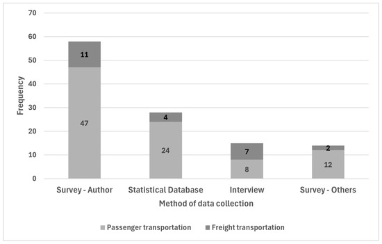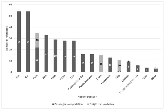 A total of 89 studies focused on passenger transport, while 17 studies addressed freight transport. Arunotayanun and Polak [14] noted that decision-making models in freight transport receive little attention, citing the complexity of the freight transport system as a major obstacle. Similarly, García-Menéndez et al. [15] highlighted that significantly fewer studies focus on freight transport compared to passenger transport. The numerical ratio of one to five in the review confirms this.