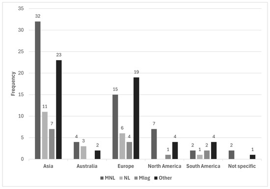 Among other decision-making models, the NL and Mixed Logit (MLog) models stand out, together appearing in 21 and 14 studies, respectively. Multiple models can be used within a single study. For example, in the research by Al-Salih and Esztergár-Kiss [17], the MNL model was applied to determine the impact of attributes on transport mode choice, while the NL model was used to assess the influence of demographic factors. Additionally, we identified numerous individually applied models and model combinations developed to address specific case studies.