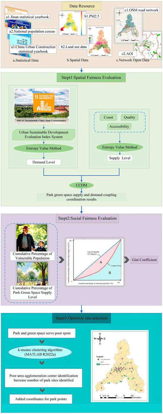 This study aims to synthesize existing evaluation methodologies for fairness in urban park green space (PGS) and further assess the fairness of PGS in Jinan City using multi-source geographic big data. To achieve this goal, the research will first integrate the SDG11 framework for urban sustainable development into the equity assessment of PGS by examining the supply-demand dynamics between residents and PGS resources. Based on this, an evaluation index system for urban sustainable development will be created to show how much urban residents want PGS resources. The supply level of PGS resources will be shown through factors like the number, quality, and accessibility of comprehensive PGS. After that, we will utilize geographic information technology to perform spatial analysis to figure out the necessary indicators. We will also use the Lorenz curve and Gini coefficient to see how fairly PGS resources are distributed across vulnerable groups. We will also look into specific tactics for improving the selection of PGS sites in places. The research framework is illustrated in Figure 1.