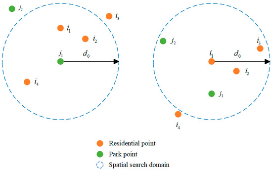 Schematic diagram of 2SFCA. Green points are park points (supply points), orange points are residential points (demand points), is the search radius, and blue dashed circles are search domains formed with supply (demand) points as centers.