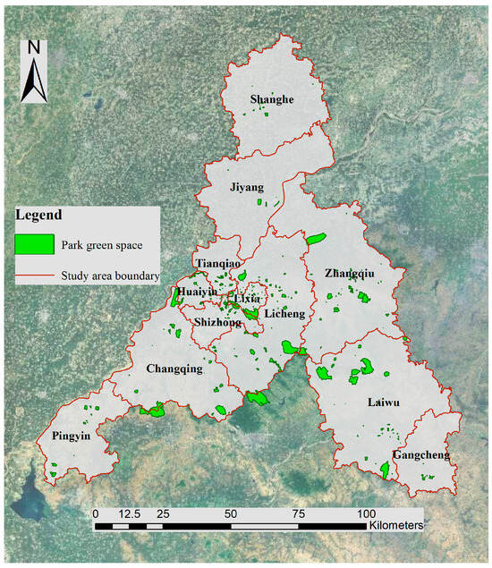 This study focuses on Jinan (Figure 2), located in Shandong Province, covering 12 districts (counties). Jinan has an area of 10,244 square kilometers and has a resident population of 9.415 million as of the end of 2022. Jinan, the capital and a renowned cultural city of Shandong Province, has recently achieved significant advancements in the development of PGS. By 2023, Jinan will own over 300 parks of diverse classifications, with a total area over 3000 hectares, resulting in a per capita area of public green space of 12 square meters.