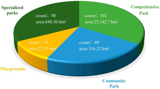 Figure 6 illustrates the numerical and area statistics of different park categories in Jinan City. The comprehensive parks constitute the largest proportion, serving as the primary venues for recreation and leisure for residents. Specialized parks, which include botanical gardens, zoos, and other function-specific parks, rank second. Community parks, designed for residents’ daily relaxation, exhibit moderate numbers and areas. And playgrounds are characterized by their limited numbers and areas.