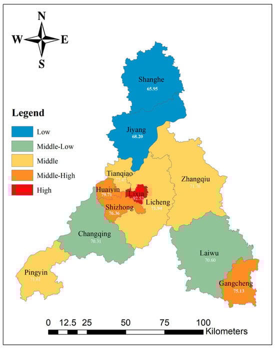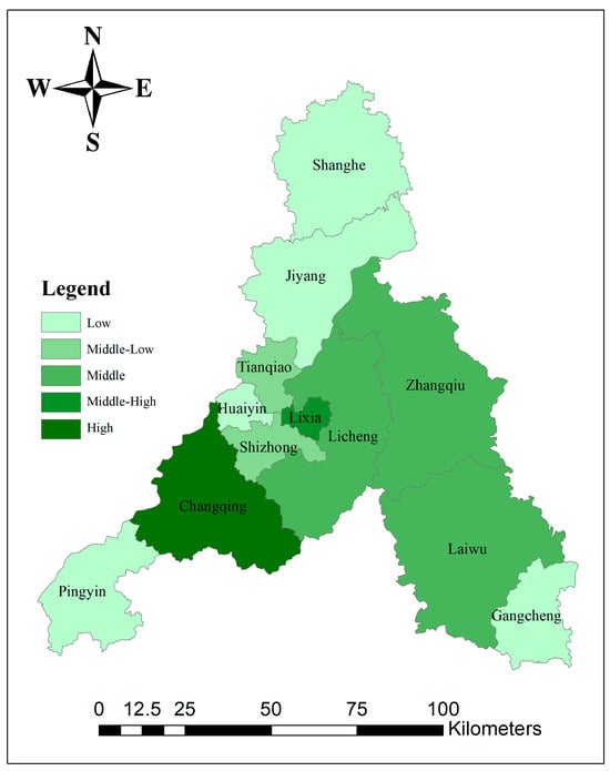 In areas characterized by advanced sustainable development, where ecological preservation and green space construction are prioritized, urban inhabitants increasingly depend on and engage with parks and green spaces, thereby directly influencing their demand for and utilization of these areas. Therefore, the higher the level of sustainable development in a region, the higher the level of residents’ demand for green park space. Figure 9 illustrates the spatial distribution of green space demand levels in Jinan. The evaluation results indicate that Lixia District possesses the greatest demand level, achieving a score of 92.52 points. Huaiyin District, Shizhong District, and Gangcheng District are classified as “middle-high” level; Tianqiao District, Lixiong District, Pingyin County, and Zhangqiu District are categorized as “middle” level; Changqing District and Laiwu District are designated as “middle-low” level; and Jiyang District and Shanghe County are identified as “low” level. Lixia District, in the historical urban core of Jinan City, is addressed in the Jinan New Urbanization Plan (2021–2035) [56] released by the Jinan Municipal Government. The plan emphasizes the necessity to enhance the human environment, safeguard the historical and cultural integrity of the city, rehabilitate urban villages and shantytowns, establish a multi-dimensional transportation network, and advance comprehensive community services. Consequently, the transportation infrastructure, urban development, and cultural amenities in Lixia District are comparatively comprehensive, and the degree of sustainable development is elevated. Shanghe County is in the northernmost region of Jinan City, characterized by an inadequate transportation infrastructure and a predominance of primary industry. It exhibits a pronounced urban-rural divide, a low urbanization rate, and is currently undergoing construction and development, resulting in a diminished level of sustainable development.