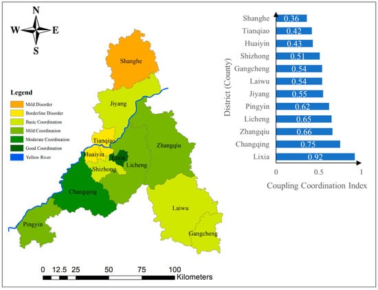 where is the coupling degree of the system, is the value of the development level of the system [43]. Assuming that the importance of each subsystem is the same, the same value is assigned to each system weight a, i.e., , and the value of the overall development level of the system, T, is calculated by the arithmetic weighting method [44], with the following formula: