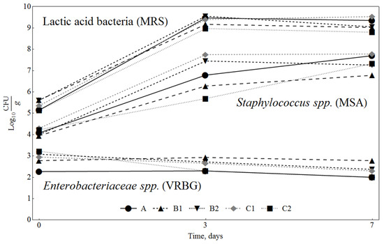 The changes in lactic acid bacteria (LAB), Enterobacteria and Staphylococcus spp. in sausages were determined during the first days of ripening [27]. A slice of 25 g of sausage without casing was aseptically transferred to a sterile plastic bag and pummelled for 120 s in a laboratory blender (Stomacher 400, Seward, London, UK) with 225 mL of Ringer solution (Oxoid, Basingstoke, UK). Appropriate decimal dilutions of the samples were prepared using the same solution, and 0.1 mL of each dilution was plated in duplicate on the following media: (1) Violet Red Bile agar with Glucose (VRBG, Oxoid), incubated at 37 °C for 24 h in anaerobic conditions, for Enterobacteriaceae counts; (2) De Man, Rogasa and Sharpe agar (MRS, Oxoid) incubated at 30 °C for 48 h, for LAB counts; (3) Mannitol Salt Agar (MSA, Oxoid) incubated at 30 °C for 48 h in anaerobic conditions for Staphylococci counts. Two replicate samples were taken for each sample on day 1 (meat mixture prior to stuffing), day 3 (end of fermentation) and day 7 (end of ripening) for microbiological analysis.