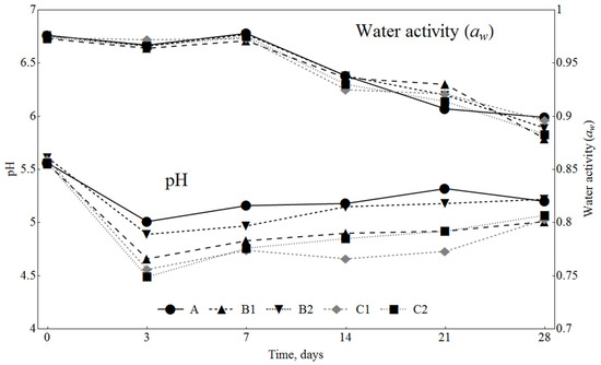The humidity, water activity and pH were observed in dry fermented sausages during storage. Humidity was determined by drying at 100 °C to a constant weight [28]. Water activity (aw) was determined using Aqua Lab CX-2 equipment (Decagon, Washington, DC, USA). The pH was measured using a pH meter equipped with a glass electrode.