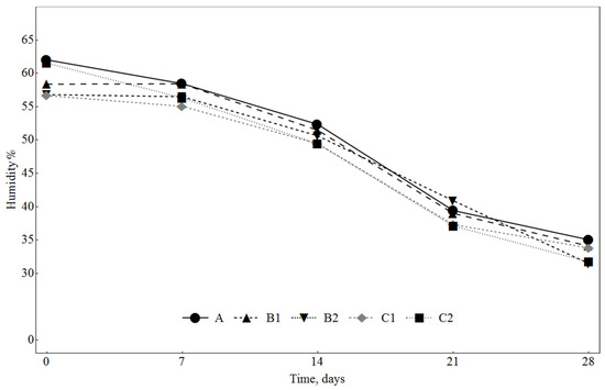 Changes in humidity in sausages during ripening. A: 0.3% ascorbic acid + 0.3% dextrose; B1: 0.5% SLE + 0.3% dextrose; B2: 0.1% SLE + 0.3% dextrose; C1: 0.5% SLE + 1% dextrose; C2: 0.1% SLE + 1% dextrose.