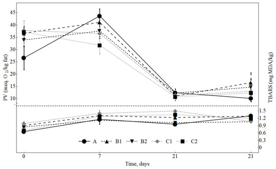 The PV of the extracted lipids was measured in sausages during the ripening time, using the AOCS Cd 8-53 official method [30]. Lipid extract (0.5 g) was dissolved in 10 mL of chloroform and 15 mL of acetic acid. Then, 1 mL saturated solution of potassium iodide was added, and the mixture was shaken by hand for 1 min and kept in the dark for 5 min. After stabilisation, 75 mL of distilled water and 0.5 mL of starch indicator (1%) solution were added. Then, the mixture was titrated with 0.002 M Na2S2O3 until the colour disappeared. PV was expressed in milliequivalents (meq) of active oxygen per kg of lipids.
