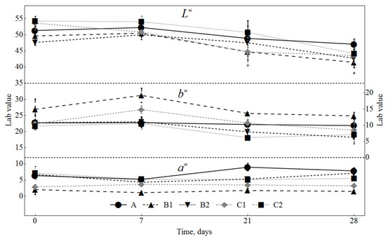 Changes in CIElab coordinates (lightness (L*), redness (a*), yellowness (b*)) in sausages during ripening. A: 0.3% ascorbic acid + 0.3% dextrose; B1: 0.5% SLE + 0.3% dextrose; B2: 0.1% SLE + 0.3% dextrose; C1: 0.5% SLE + 1% dextrose; C2: 0.1% SLE + 1% dextrose.